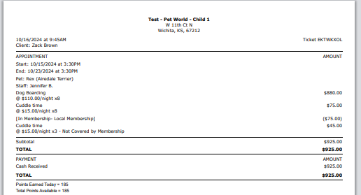- Once the appointment is saved, you can locate and open it on the schedule. From there, you can create a ticket in POS and print a receipt once the ticket is closed. Both the ticket and the receipt will clearly indicate the number of nights covered by the membership/package, as well as any nights that are not covered. Additionally, they will specify the total amount for the services not covered by the membership/package.