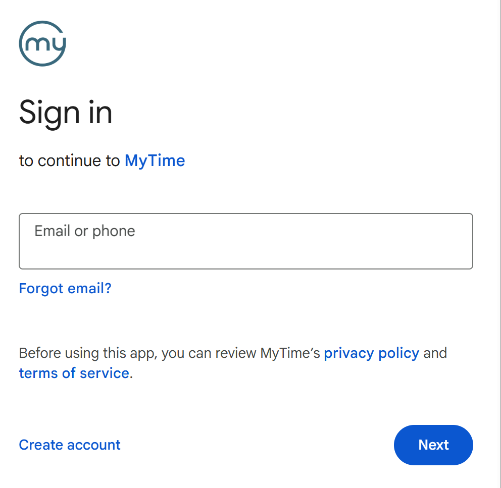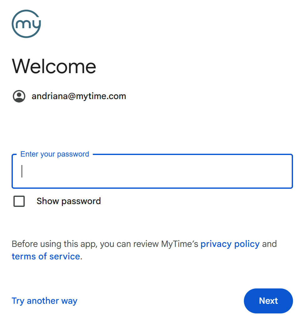 • When signing in with a social account, the system automatically identifies the correct staff profile by matching the email address of the Google or Apple account with the one on file in your MyTime staff profile.