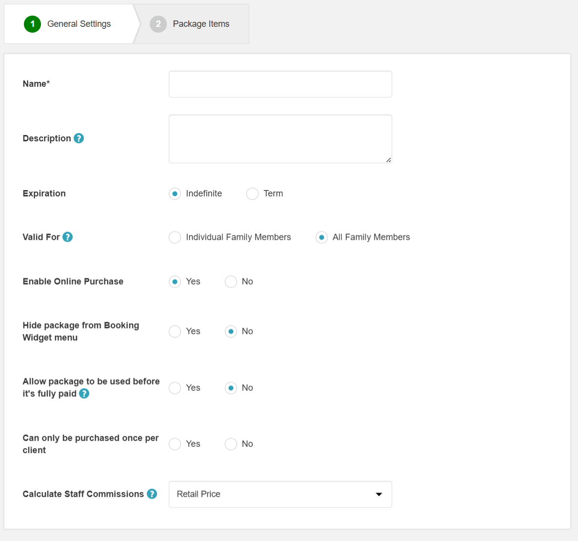 • Staff Commission: Choose how staff commissions are calculated for package items: