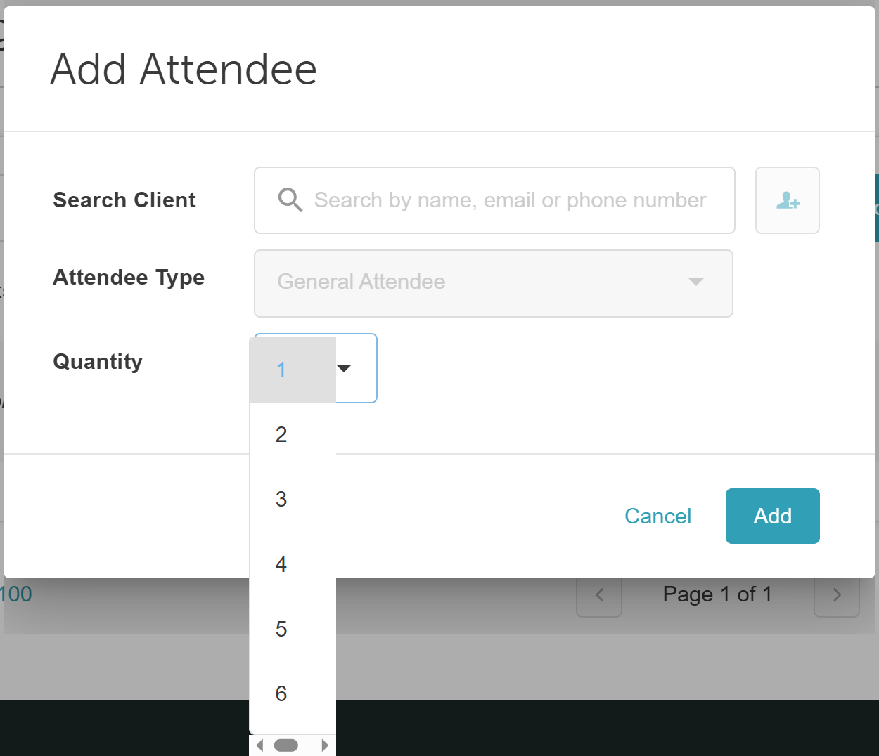 - If the "Allow Selecting Session Enrollment Attendee Quantity on Roster Page” setting is enabled, use the Quantity field to choose how many spots the client would like to book for that attendee type