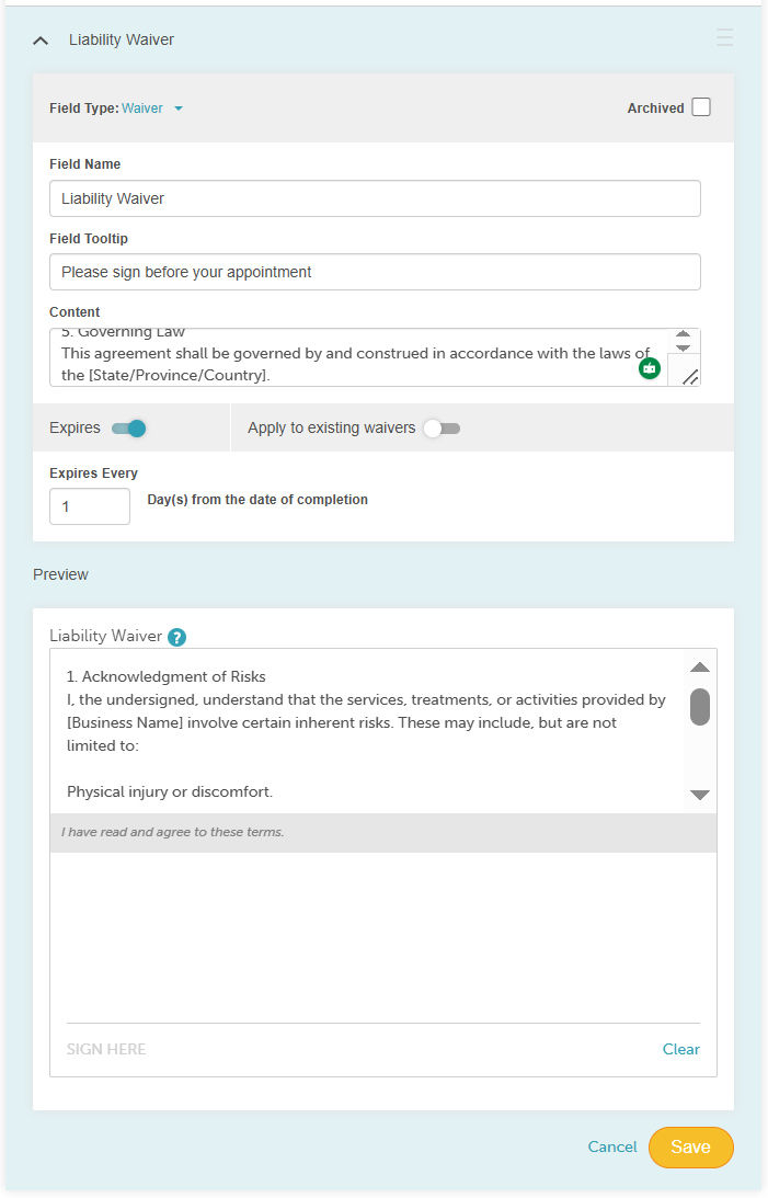 - Expires Every: Configure the number of days after a waiver is signed should it be expired