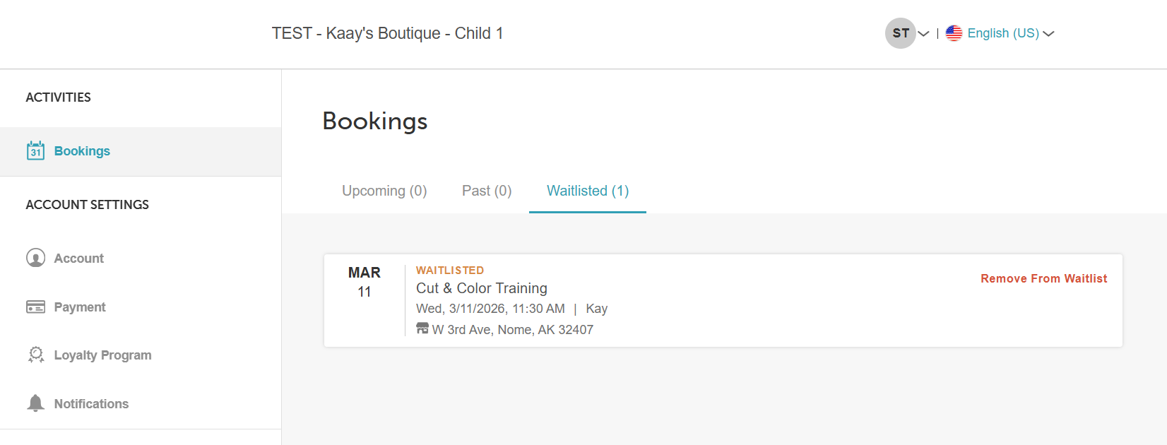• Waitlist Entries: If your account has the Waitlist feature enabled for services or classes, any pending waitlist entries will also be displayed here. This allows clients to track their status and see where they are currently in line for a spot.