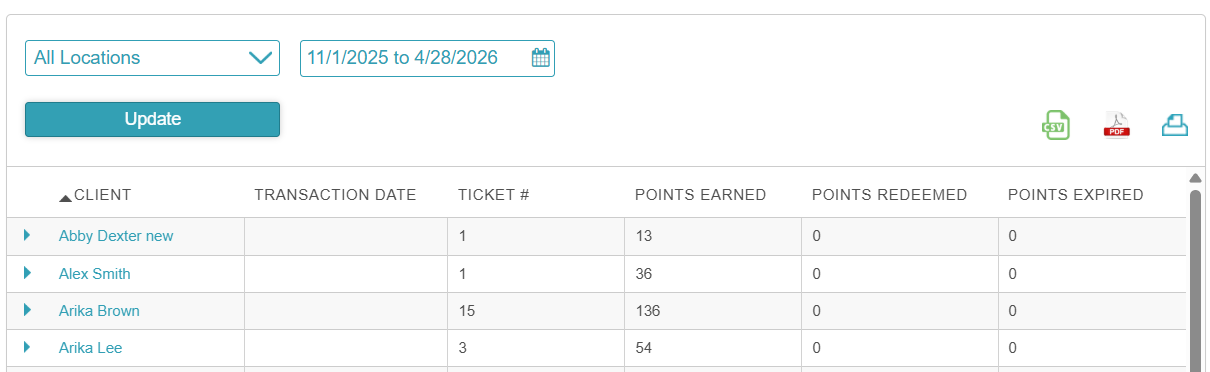 - Manual adjustments to loyalty points on a client’s profile are not reflected in this report.