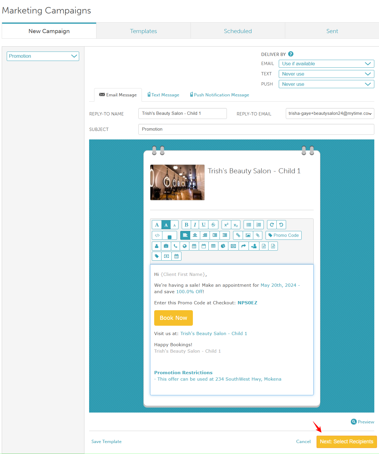 - If a campaign is sent from a location different from where the client had their last appointment, the address displayed in the campaign will reflect the location from which the campaign was sent, not the location of the client’s last appointment.