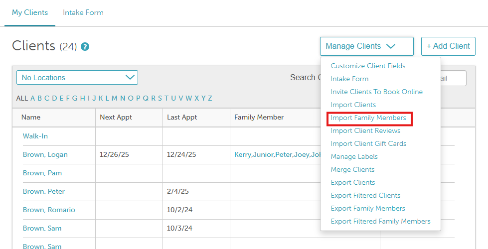 2. Select the ‘Manage Clients’ drop-down menu > Import Family Members