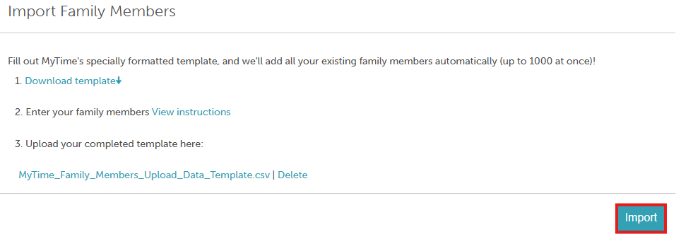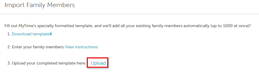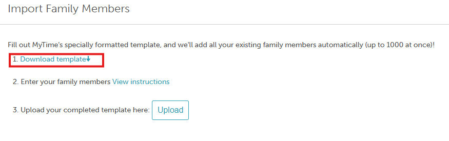 3. The screen below will appear. Download the MyTime Family Members Import Template