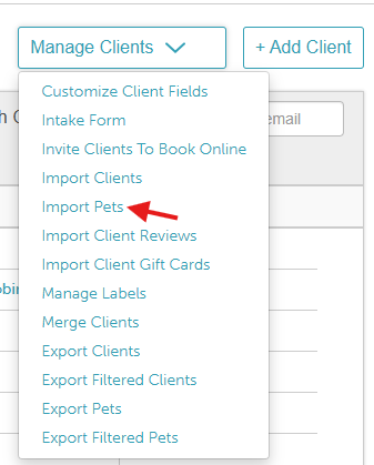 2. Select the ‘Manage Clients’ drop-down menu > Import Pets