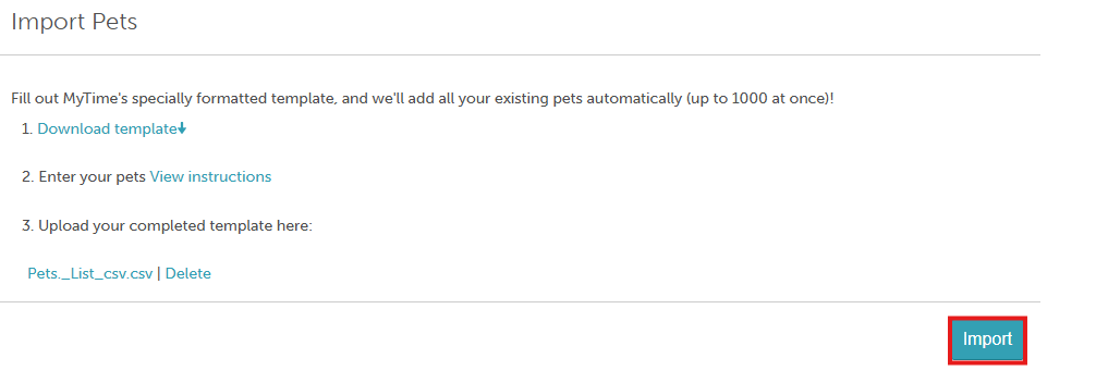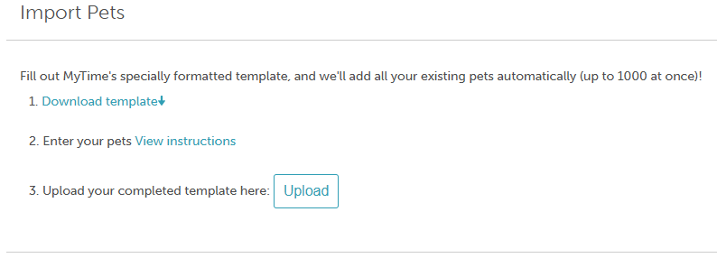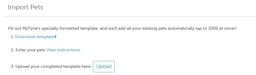 3. The screen below will appear. Download the MyTime Pets Import Template