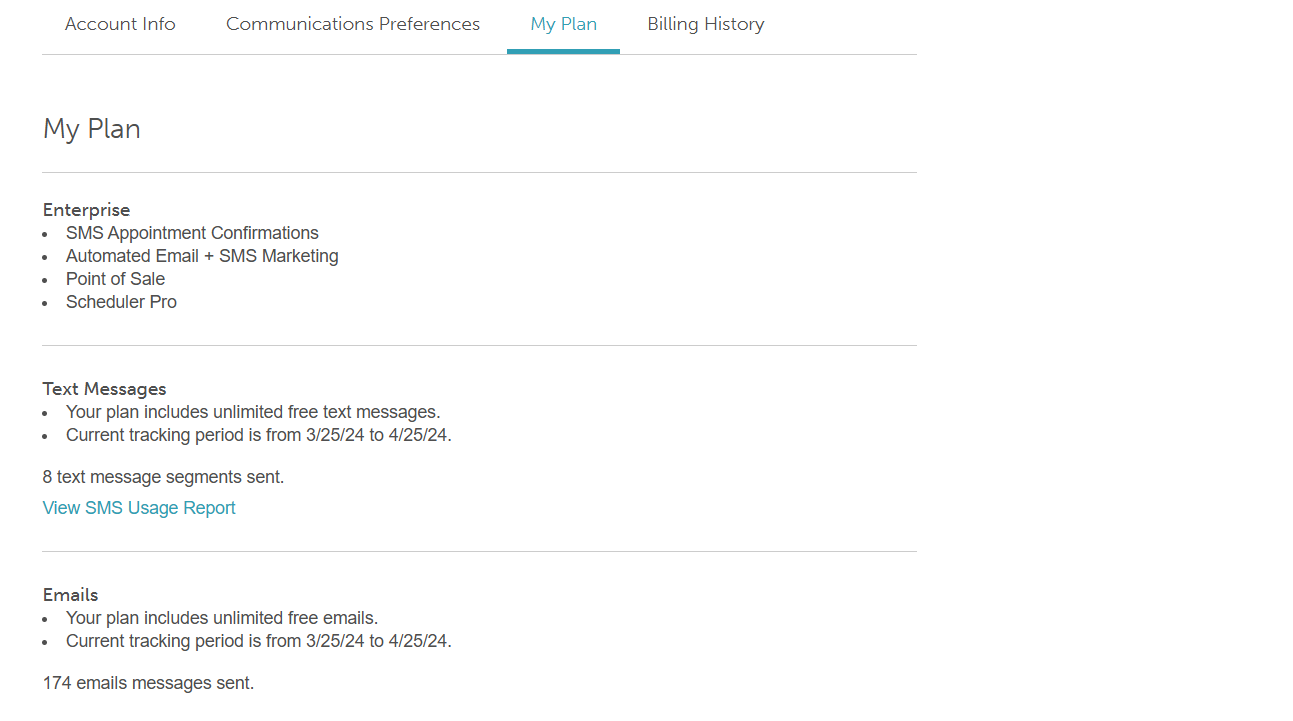 - Track Messaging Usage: Track Messaging Usage: Monitor your real-time email and SMS volume for the current billing cycle, with a direct link to the SMS Usage Report to view a detailed breakdown of message segments and their sources for any specified date range.