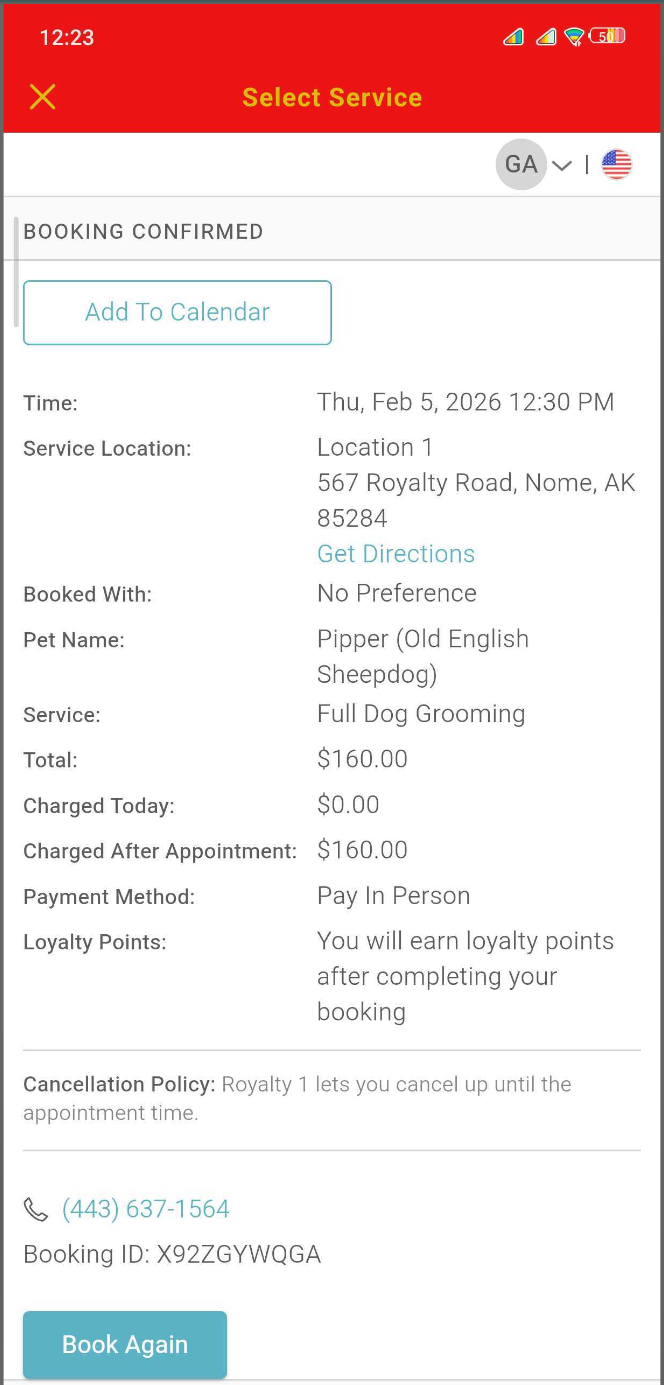 To book another appointment for the same service, use the Book Again button to navigate to the Time Picker