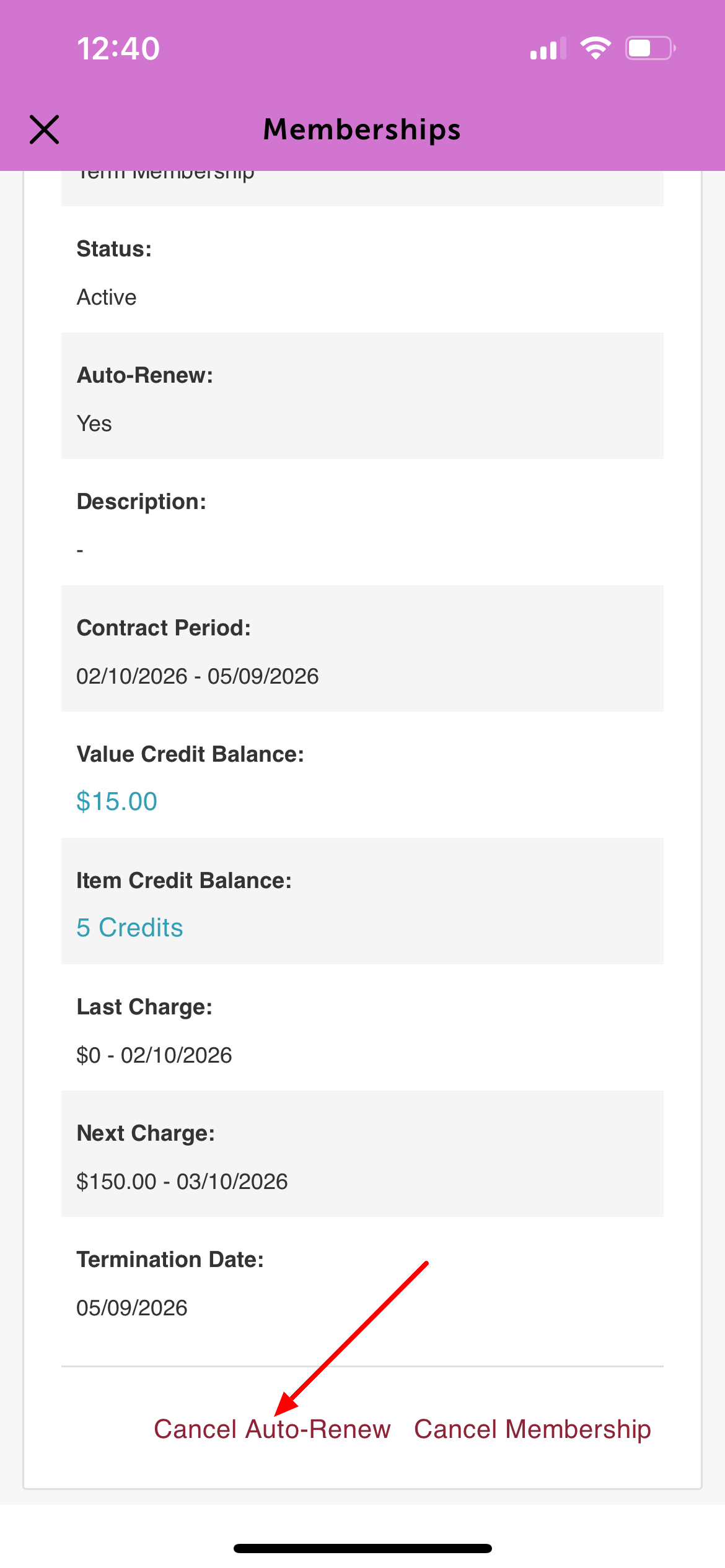 Clients with term-based memberships can cancel the auto-renewal feature directly from the guest app.