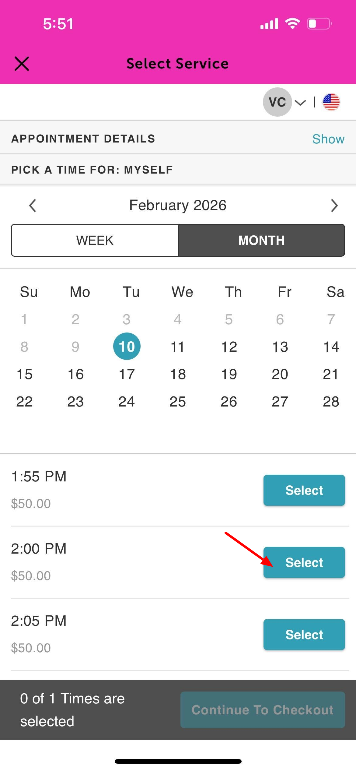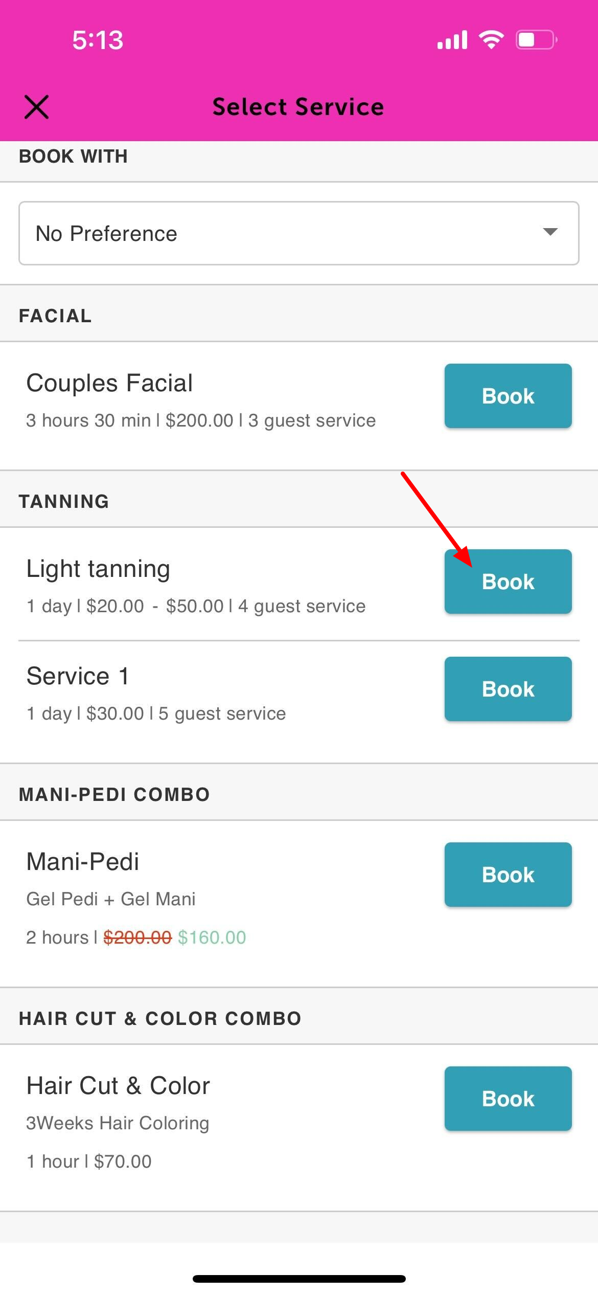 6. Tap Book next to the desired service