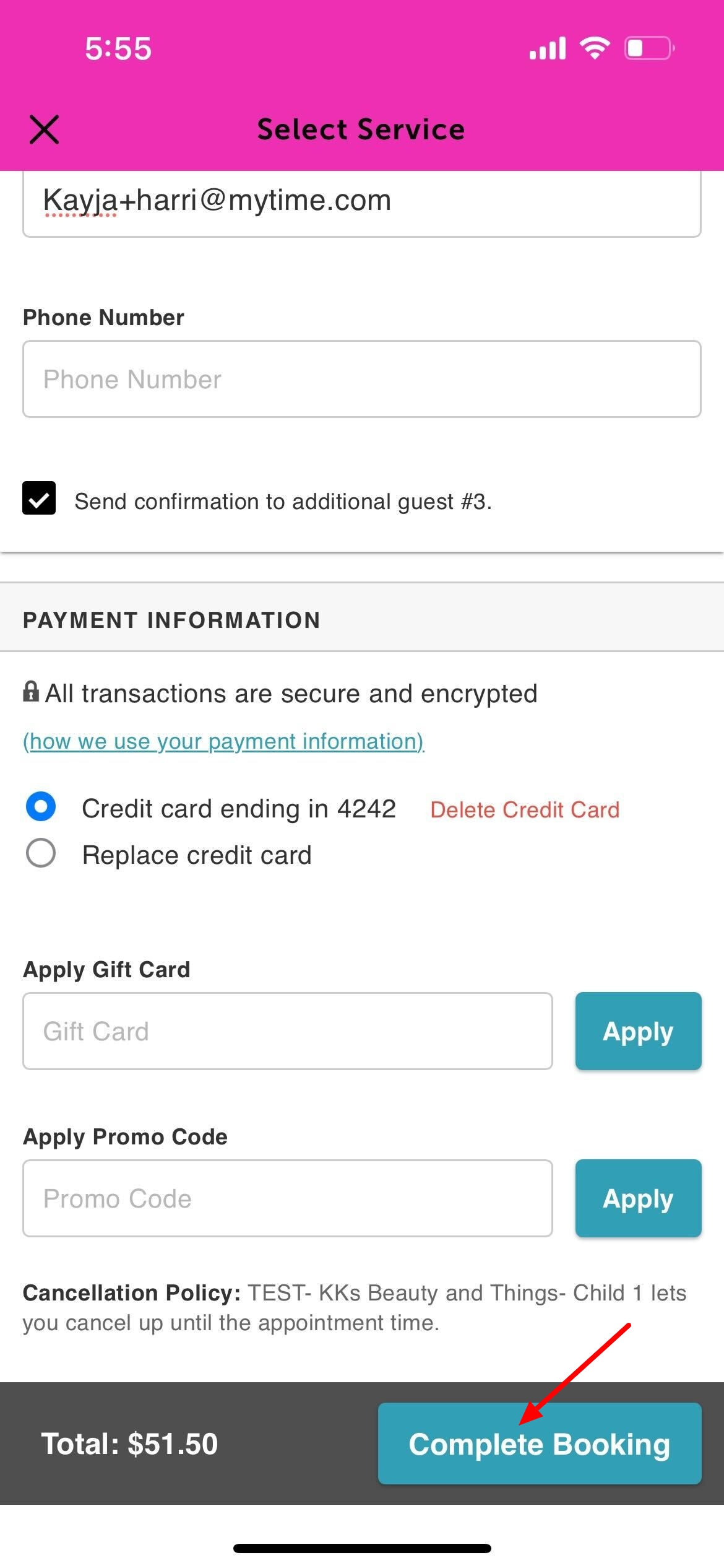 9. Tap 'Complete Booking' at the bottom of the screen